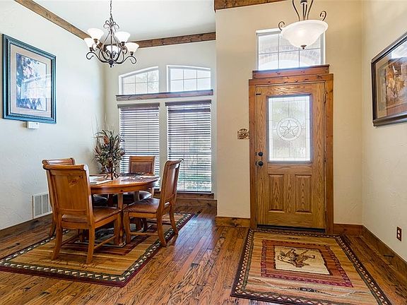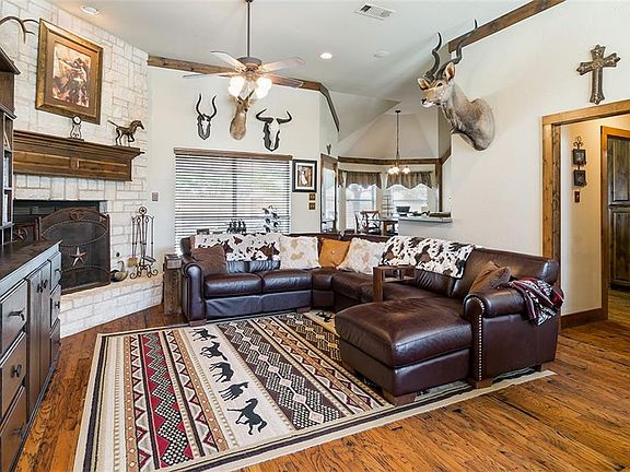 A beautiful and immaculately kept home in Sanger. Cedar trim throughout the home, a stone fireplace, wood floors and vaulted ceilings give this home impressive detail. The kitchen features detailed wood cabinetry, and updated appliances. Large windows throughout give way to natural light. The Master suite features an open layout with a separate shower and soaking tub. A large covered patio and fire pit make this a great space for entertaining and enjoying time outdoors.