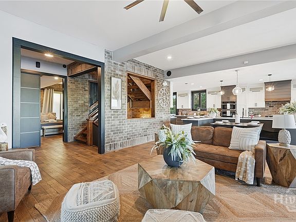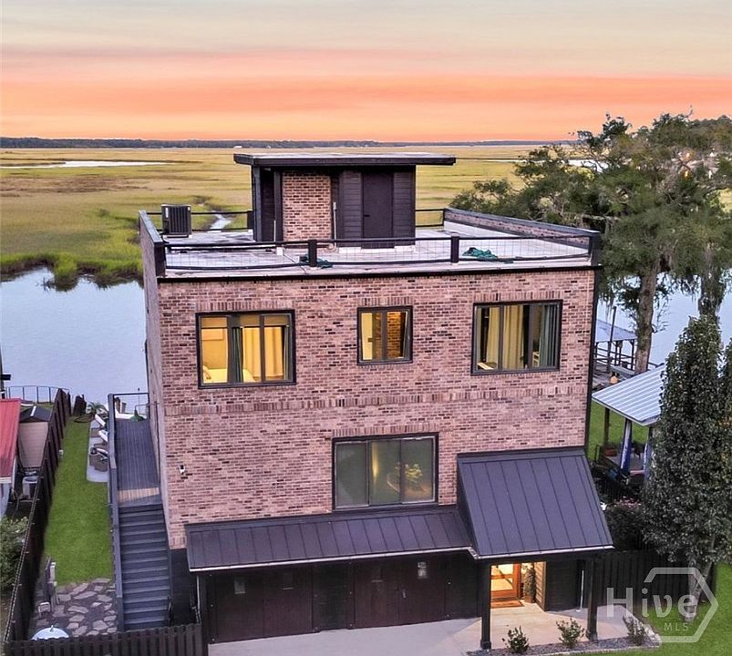 Waterfront sanctuary meets modern luxury on Jerico River! Serene sunsets w/ sweeping views from every floor of 4 bedroom, 3.5 bath deep-water oasis. Open floor plan, elevator, oak flooring, exposed brick, soaring ceilings, & walls of windows flood living area w/ natural light. Gourmet kitchen w/ wine bar, coffee bar. Main suite is private escape w/ panoramic views, spa-like bathroom & huge closets. Ground floor features 2-car garage, ½ bath & expansive flex-room opening to pool area, perfect for a game room, media room or guest space. Ground-floor patio w/ tons of outdoor storage & outdoor shower. Multiple outdoor living areas-expansive ground-floor patio, massive 2nd floor deck just off kitchen/main living area, fiberglass cocktail pool, & private covered dock w/ new decking. Currently STVR w/ solid rental history. Furnishings are negotiable-potential turn-key STVR. No flood insurance required & no HOA.30 minutes to Savannah, 20 minutes to Hinesville, 15 minutes to Richmond Hill.