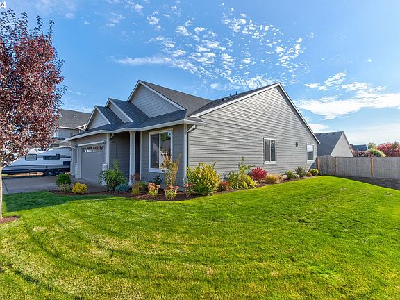 One-level living in a quiet neighborhood! Discover this like-new, single-level residence built in 2021, perfectly situated on a sizable .2-acre corner lot. The open floor plan, accentuated by vaulted ceilings and an abundance of natural light, makes this home feel exceptionally spacious. Beautiful kitchen featuring stainless steel appliances, a generous walk-in pantry, quartz countertops, insta-hot water tap, and an eat-in island. The vaulted ceilings continue into the primary bedroom which offers direct access to the thoughtfuly landscaped backyard. The adjoined primary bathroom boasts dual Delta sinks, a walk-in closet, tile shower with dual heads, and a bathtub. Step outside to enjoy year-round entertaining on the covered patio or unwind underneath the charming gazebo. Spend your summers floating in the above-ground pool sitting atop low-maintenance turf. Additional features include a 3-car high ceiling garage, utility sink, RV parking with an exterior faucet and plug, hot/cold hose bib for the pool, and car charger. Easy access to Highway 47 and Highway 240, local schools, and dining. A short drive to Willamette Valley wine country! No HOA.
