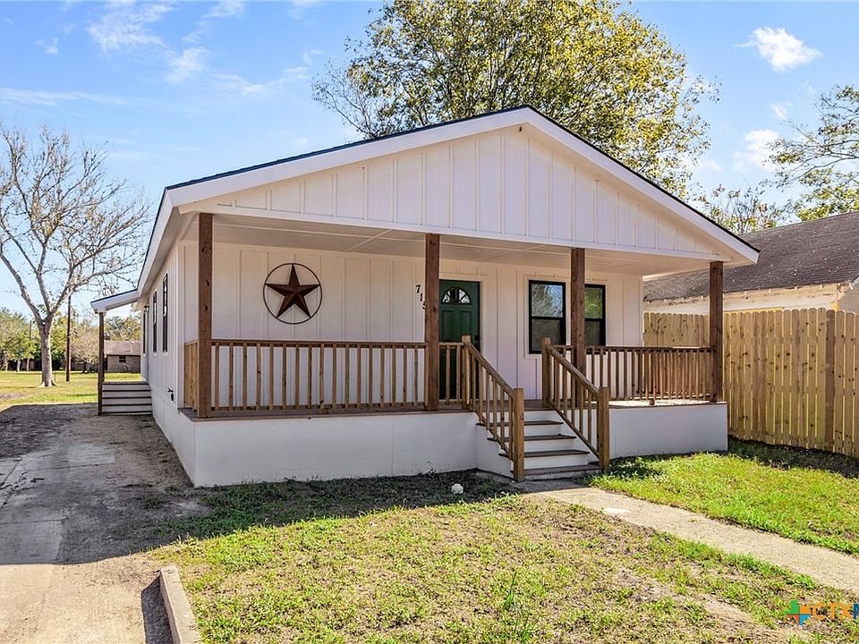 Welcome to where modern luxury meets southern charm! This brand-new construction offers an inviting open concept layout, with 3 bedrooms, 2 bathrooms, this home is sure to impress. Step inside to discover the beauty of luxury vinyl flooring throughout. The heart of the home is the stunning kitchen, complete with butcher block countertops, a spacious kitchen island, and ample cabinet space. Venture outside to the full front porch, where you can sip your morning coffee as you take in the peaceful surroundings of this charming neighborhood. This property also has alley access from the back of the lot, perfect if someone wanted to build a shop on the property. Located in Yoakum, you'll enjoy all the conveniences of small-town living with easy access to nearby amenities. From local shops and restaurants to parks and recreational activities, there's something for everyone to enjoy in this vibrant community.