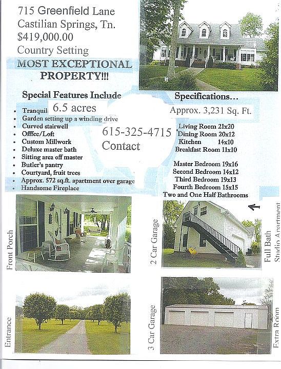 Lovely country setting nestled back from the Rd. Plus, an additional (113.4 ft. on Road by 400 ft. deep) 1.04 acre buildable lot located road front on 715 Greenfield Ln, Castalian Springs, Tn. Additional 3 car detached garage workshop with an extra room on end of building for office, workout, crafts, sewing, storage what ever is your pleasure.
