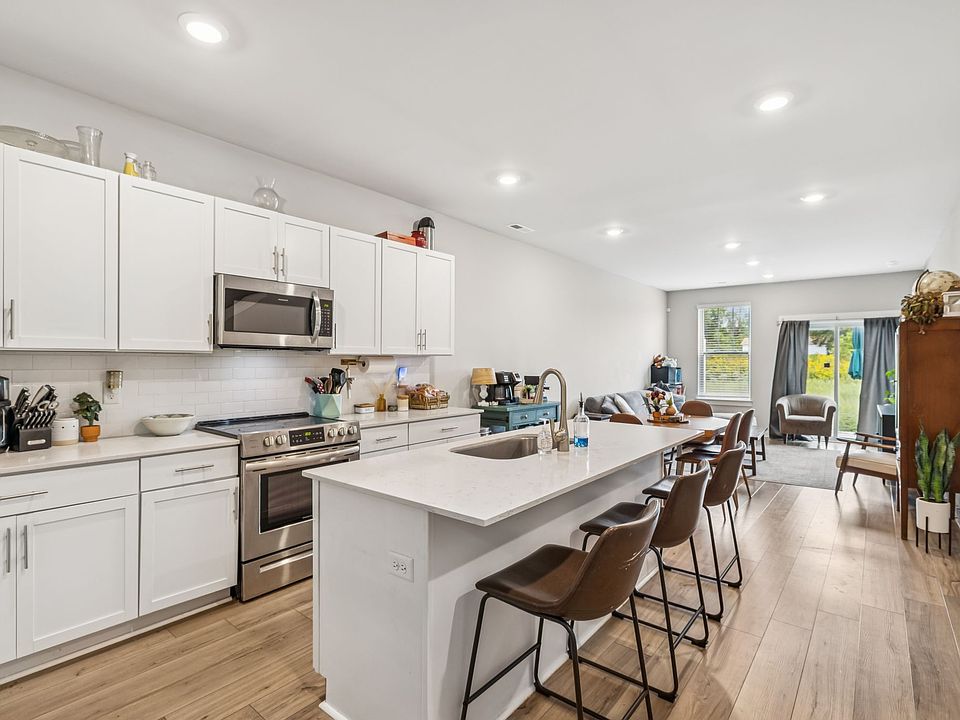 Contemporary finishesNeutral colorsOpen floor planStainless steel appliancesDownstairs laundry roomModern cabinetryStylish kitchen
