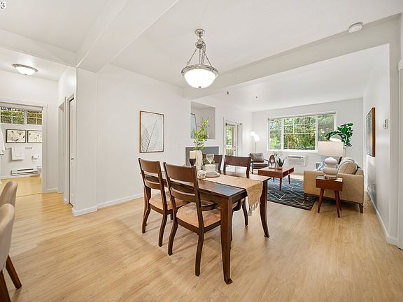 Open house: Sun (10/29) 1PM-3PM. Welcome to this gorgeous single-level condo located on the lower/ground floor (accessible by stairs) with freshly painted walls/ceilings and oversized windows looking out to lush green space. Enjoy generously sized rooms and LVP throughout. - NO carpet! 2 bedrooms, 2 baths, and a custom "mini-office" with beautiful, high-quality built-ins and a quartz-topped desk. You'll appreciate the huge kitchen with extensive cabinetry, pantry, eating bar, and SS Appliances. Roomy dining area and very inviting living room with cozy electric fireplace opening onto a big covered, gated patio perfect for extended living space. The primary bedroom, with its attached bath w/dual sinks, has a walk-in closet with custom built-ins. The second bedroom is adjacent to another big bath. The true laundry room includes a washer and dryer. This condo has so much storage! Top-down/bottom-up blinds throughout provide privacy while still allowing for views and natural light. Each room has its own thermostat for efficient heating and the primary bedroom and living room have wall cooling units. The garage (located one floor up) with extensive attached shelving opens into the secure building. The HOA fee includes water/sewer, exterior maintenance, and multiple community parks and green space. Walkable to Timberland shops, restaurants, and gyms. Moments to Sunset MAX and HWYs 26 & 217. Conveniently located right between high-tech Hillsboro and Downtown Portland! This one is a 10!
