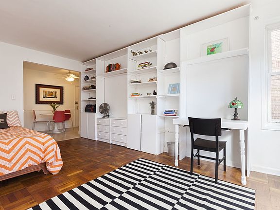 Contract signed. This cheerful corner second floor studio offers the perfect combination of efficiency, convenience, and functionality. The adorable unit features a versatile dining foyer with a large closet and an airy living area with parquet flooring, custom built-ins galore, and two exposures with three oversize windows that envelope the tranquil space with southern sunlight and gentle breezes. The galley kitchen is separate from the living area and has a dishwasher. There is also a full windowed bathroom and a dressing area with an additional closet. Set back from majestic tree-lined Ocean Parkway, the solidly constructed post-war elevator building is just minutes from the F train at 18th Avenue along with shopping on McDonald Avenue. A quick 15-minute stroll brings you to the vibrant neighborhood of Ditmas Park with its array of hip restaurants, cafes, and bars and eye-catching Victorian architecture. It is also an easy bike ride or drive to both Prospect Park directly to the north and to all the attractions of Brighton Beach and Coney Island to the south. The elevator building features a live-in super, common laundry facilities, storage (with a waiting list), and bicycle storage. Pets are not allowed. Sublets are permitted with board approval for up to 2 years after 2 years of residency with a fee equal to 2 months maintenance. Speaking of maintenance, it includes heat, hot water, and real estate taxes.