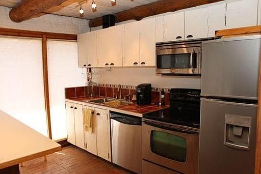 Downtown Casita - 2 bedroom & 2 bath with private patio area. Application Pending! Absolutely the cutest casita you will find walking distance to the plaza and hidden off the street for privacy. Located on Old Santa Fe Trail is this casita built in 1981. Exposed Adobe walls throughout, Kiva fireplace, Large beams with vaulted ceilings and passive solar windows provide lots of light and warms the house in the winter months. Features include brick floors throughout, Kiva Fireplace in living room, built-in bookcases in living area and dining area, Stainless steel appliances, 1 full bath plus 2nd bathroom with shower. Washer/Dryer included. Private courtyard with lockable front gate includes an outdoor fireplace, brick patio area, and a fountain feature. Parking for 2 midsize vehicles. This is a NON-smoking property. Owner will consider a small dog with additional pet deposit and references. No Cats allowed. This home does NOT include furnishings.