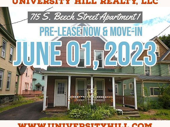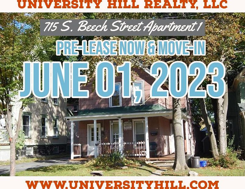 Available for move-in June 01, 2023 for $900/month + utilities. University Hill Realty has 715 S Beech Apt 1 available for pre-lease with a move-in date of June 1, 2023. A block away from Westcott St, this beautiful first floor apartment with a front porch, off-street parking and hardwood floors. Visit universityhill.com to see all our available homes for pre-lease for the 2023-24 school year. 715 S Beech St Apt 1 is an unfurnished 2bed/1bath for $900/month + utilities and available for move-in JUNE 01, 2023. The unit has shared off-street parking and coin-op washer & dryers in the basement. No pets please. Tenants cover utilities and are provided with EnergyStar appliances and LED lights.