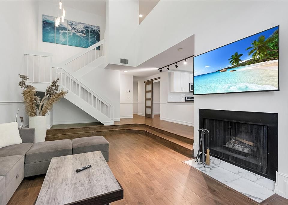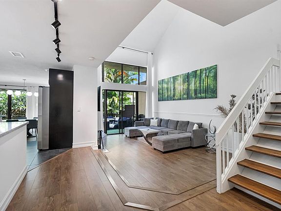 Exceptional end-unit townhome located in highly desirable East Boca Raton. 3 bedrooms, 3 bathrooms, and a versatile flex room downstairs with a custom barn door, ideal as a fourth bedroom. The interior features a sunk-in living area, soaring ceilings, a fireplace, and no shortage of large windows. The renovated kitchen showcases modern finishes, upgraded lighting, and neutral flooring. The bathrooms have been thoughtfully updated with modern vanities. Spacious primary suite and bath with dual sinks, and a luxurious soaking tub. Outdoor spaces include a private turf balcony and patio with tranquil lagoon views. Minutes from Florida Atlantic University, Boca Town Center, Mizner Park, A-rated schools and beaches. This is your opportunity to own a move-in ready townhome in East Boca Raton.