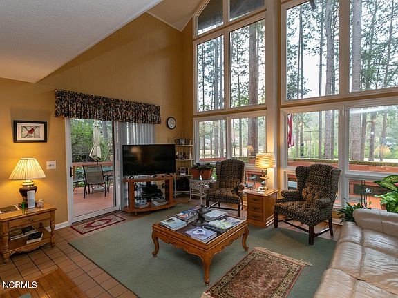 Unique and charming golf front home nestled among the pines along the 15th fairway of Pinehurst course No. 5. This A-frame home offers beautiful views inside and out! With more than 24 windows, including a 32-foot-tall center section in the great room, you can take in views of the 15th hole, the 14th green and water feature as well as breath taking sunrises and sunsets. In addition to the great room with its brick, gas log fireplace, the main level includes a dining room, kitchen, primary bedroom, full bathroom, and nice flex space that could be used as a recreation room (currently used as a golf room), workshop or office space with a walk-in closet and sliding glass doors that open to the patio. The upper level includes a loft area overlooking the great room, a bedroom and full bathroom. A huge redwood deck on three sides across the back is an entertainer's dream, also perfect for relaxing and taking in the fabulous views. This home is just minutes from Pinehurst Resort and five of its nine (soon to be 10) golf courses – including the famed No. 2 that will be hosting the U.S. Open championships starting next year – the popular Cradle par-three course, a multi-million-dollar pool complex, as well as the USGA's second headquarters and golf museum now under construction, the historic Pinehurst Harness Track and its famous Track restaurant, Fair Barn and the Lake Pinehurst Beach Club. This home must be seen in person to truly appreciate its charm. A transferrable Pinehurst CC membership available.