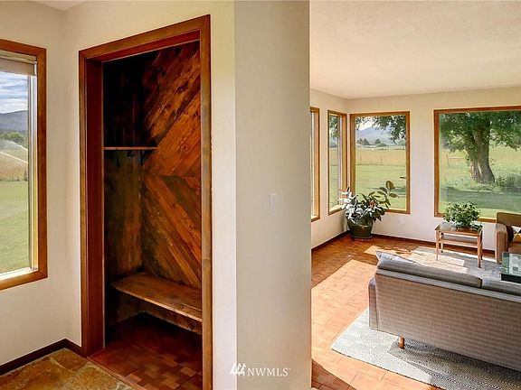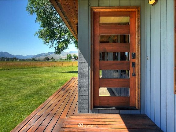 Just one mile from downtown Winthrop on the backside road to Twisp. Truly one of the best unobstructed views in the Methow Valley-a protected 180' view from the Sawtooth Mountain Range to Mt Gardner and up the valley to the North Cascades. This stylish ranch rambler has been completely customized w/a mid-century modern aesthetic by a local designer. Open floor design is perfect for entertaining with two living areas, dining room & large kitchen with bay window breakfast nook. Inviting back deck shaded on hot summer afternoons. Coveted irrigation shares for just over five acres provides firewise safety & maintains its agricultural appeal. Create your perfect healthy work-life balance in this peaceful country home with a million dollar view.