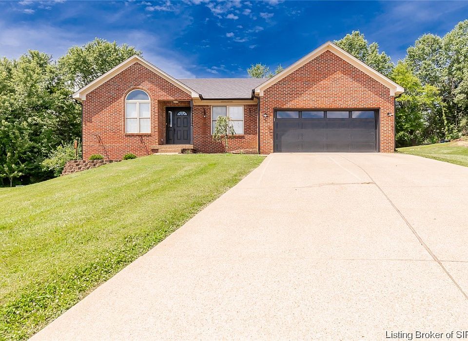 Open House, Sunday, 7/16, 2 - 4! Large brick ranch with 3-5 bedrooms and 3 full baths! Spacious open concept floor plan! Brand new kitchen with custom island and granite countertops! New flooring! Fresh paint! New light fixtures! New deck! 2 car attached garage with custom epoxy floor! Oversized 1 car detached garage for additional storage! Tons of privacy in the tree lined backyard! Cul de sac location with low traffic and Scribner Middle School is just steps away! As you pull up, you'll love the beautiful black accents on the exterior and the new insulated black garage door! Entering the home, you're welcomed into the open floor plan with new plank flooring! The living room flows into the brand new custom kitchen with white shaker style cabinets, granite countertops, huge farmhouse sink, and island with breakfast bar! Dining area is off the kitchen and walks out onto the rear deck that overlooks the private back yard! Down the hallway are 3 good size bedrooms including the primary suite and 2 full baths! The suite is a great space to relax after a long day! The primary bathroom is updated with ceramic tile plus there is a roomy walk in closet! Downstairs in the basement is a great size family room plus two additional rooms that could be used as bedrooms(no egress windows), offices, or work out space! Check out the wall of lockers! The full bathroom rounds out the basement! All this and a wonderful location that is easily accessible to all of Southern Indiana and Louisville!
