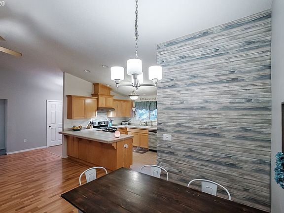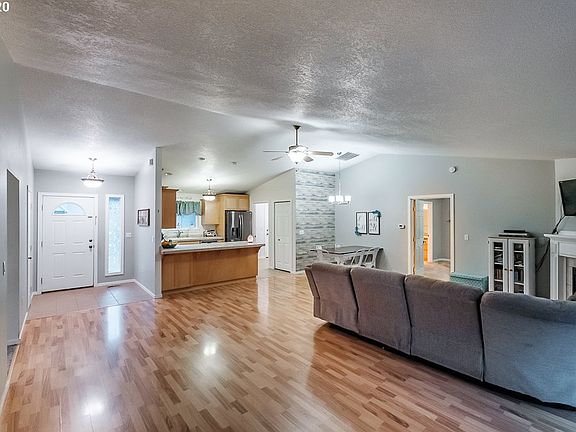 This well maintained single level home sits on a private flag lot. Open concept with vaulted ceilings, laminate flooring, and cozy gas fireplace. Kitchen has tile floors and tile counters. The backyard is fully fenced with a patio and garden boxes.