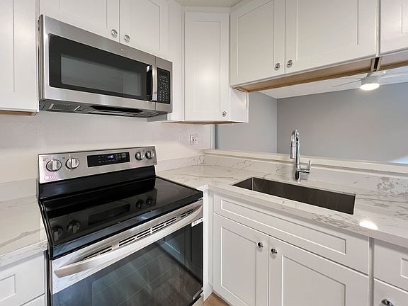 Modern upgradesLarge private patioCarrera-style quartz countertopsFully remodeled kitchenStainless steel appliancesOverhead built-in microwaveDual-pane windows