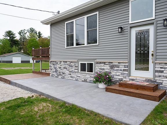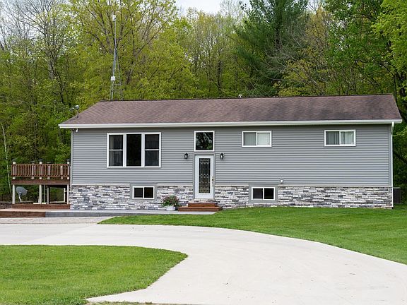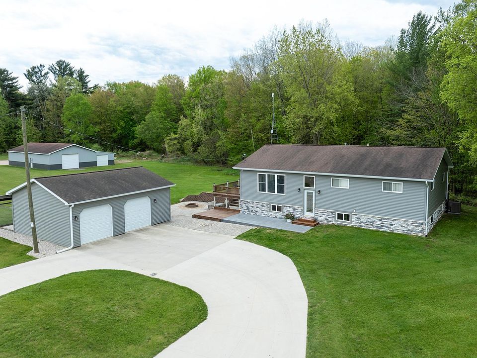 Calling all nature lovers! This charming bi-level home offers the perfect blend of comfort and privacy on a sprawling 5-acre parcel. Imagine waking up to serene sunrises and gentle breezes, all just minutes from town. This home has an open floor plan, with 3 bedrooms 1 bath on the main level and additional bath in the walk out basement area. Tons of storage throughout the house. Updates include concrete countertops and 5x5 concrete kitchen island with all newer stainless steel appliances, and kitchen cupboards. The laundry room is on the main level. As you venture downstairs you will enjoy additional room to roam in this full finished walkout basement that opens to a stamped concrete patio with firepit, along with a wrap around deck that is perfect for entertaining additional guests. Outside you will find a detached two car garage, with heated floors, and a lean to covered area that sports a dog kennel. As you leave the yard and head east you will be welcomed with an additional 32x64 Pole building that has a 16 x64 enclosed lean to. All of this and more is what awaits you when you arrive on this 4.96 acres. Hurry, this will not last!!!!!!!