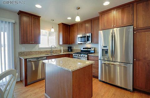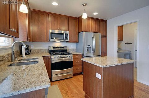 Nothing to do here but move in -- like new, only better! Professional remodel with high quality finishes. New cabinetry, slab granite counter tops, wood floors, tile in laundry and baths, SS appliances (gas range w/electric oven & warming drawer, refrigerator and high efficiency dishwasher. New interior and exterior paint. Full finished basement. Wood window blinds. Insulated and finished garage. Fully landscaped with sprinkler system, privacy fence and backs to green space. Covered patio.
