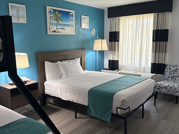 Welcome to the Sarasota Cay Club at the Ramada! This 1st floor, 1-bedroom,1-bathroom condo is a fantastic place to live with ALL UTILITIES INCLUDED! Fully furnished and recently updated, this unit includes stunning wood plank tile flooring throughout, fresh neutral paint, larger-sized fridge, full-sized desk, 65" Smart TV and more. The room is nicely furnished with a queen bed + Bunk bed. Rent includes electric, cable, wi-fi, water, sewer, trash, pest control, and local phone calls. Sorry, no pets are permitted. You can't beat this location! Just off Tamiami Trail on the Sarasota Bay waterfront, you will have access to all the hotel amenities, including an on-site laundry room, Tarpon Bay Grill and Tiki Bar, a gym, free parking right in front of the unit, and the beautiful heated Olympic-Sized Pool! Qualifications: We run a complete background check that includes credit, income verification, prior landlord and eviction history. In terms of credit, we look at the entire picture as opposed to just the credit score, but in general, we do require a score over 550. All Utilities included 6, 7 or 1 year leases available