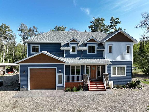 A custom-built 2,236 sq ft 6 bedroom, 3 bath home on 2.91+/- acres in Hilltop Estates, just 15 minutes West of Grande Prairie. This 2-storey home features a main floor primary bedroom, a full bath, kitchen, living room and large entry. The upper level has 5 more bedrooms, 2 bathrooms, a laundry room and a flex space. Beautiful wood plank flooring throughout the home. Energy-efficient construction with balance of new home warranty. There are covered decks front and rear, an 800 sqft attached garage with heat, floor drain and a 12 ft high door. Located in the NE corner of the subdivision, there is pavement on 2 sides of the property. The home and yard were developed, leaving mature trees providing windbreak and privacy. There is a large fenced garden area, greenhouse, storage sheds, wood shed, treehouse and fire pit. There are many fruit trees and raspberry bushes. There is lots of parking and a circular driveway. This is a great home and property with the right location. Great value for the price. Call your Realtor® of choice for more information and an appointment to view.