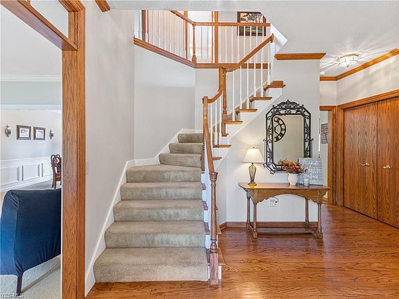 This beautiful one owner custom home built by Fleishour Homes located in beautiful tree lined Wellington will go quickly as it has what today's buyer is looking for! The pride of ownership shows as the home is so well maintained and has had many updates. Enter your front door to the beautiful wood floors and focal point of the custom staircase. Step into the open floor plan of the lounging/living room and formal dining room so perfect for entertaining. The kitchen will delight any chef with the ample counter space, custom cabinetry and island. The floor plan offers the desired open area from great room to dinette and kitchen. With the warmth of the brick fireplace and wall of custom built-ins complimented by the vast windows bringing in the natural light and views of the rear patio and mature trees the home makes for a very welcoming feel. Two walk out areas, one off of the dinette and one from the great room, to the well planned double patios makes for easy access to outdoor entertaining. Master suite offers pitched ceilings, large walk in closet, grand bath with jetted garden tub and newly updated tile shower. Additional bedrooms are large is size with ample closet space. Finished lower level with lounging area and small office area. Just wonderful rear property with great views!!! Very pleasing home!