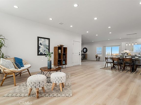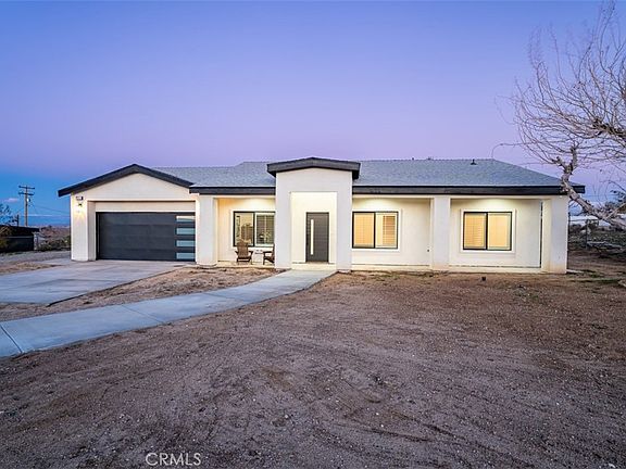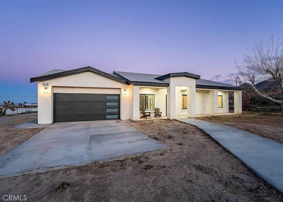 This beautifully remodeled home in Joshua Tree is designed with both convenience and style in mind. The thoughtful layout includes wiring for security cameras and smart home controls. With internet and outlets in each room, setting up a flat screen is a breeze. The large open floor plan and high ceilings create a spacious feel, while newly installed dimmers set the mood with ease. The cozy electric fireplace in the living room adds to the atmosphere. The flooring is newly installed with high-quality vinyl, and the bathrooms feature modern upgrades like frameless glass shower enclosures and LED vanities. The kitchen is a chef's dream with soft closing cabinets and drawers, quartz counters, and under cabinet lighting. Each bedroom has custom window shutters and a fan with a remote, along with custom interior doors and closet doors. The garage features brand new lighting and an insulated all custom door, as well as an EV charger. The backyard is ready for patio furniture installation with pre-set patio footings.