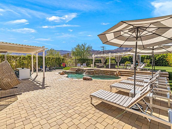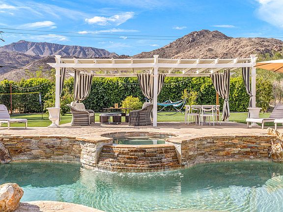 This luxurious private estate in South Palm Desert, set on a sprawling acre lot, offers the perfect blend of designer elegance and functional living with 5 bedrooms, a movie theatre, and a host of entertainment features including a private gym, gamer lounge, ping pong, air hockey, pool table, and foosball table. The chef's kitchen boasts high-end appliances, while the home also includes two laundry rooms and multiple balconies with stunning views. An expansive solar panel system and 2 Tesla Powerwalls ensure your electric bill is low and the existing electric car charger in the garage adds convenience. The beautifully landscaped backyard is a serene oasis, featuring a natural-looking pool and spa, 7 hole putting green, hammock nest, outdoor kitchen, cabana, cozy fire pit, and multiple seating and dining areas, all framed by gorgeous mountain views and complete privacy. With a massive driveway capable of fitting up to 20 cars, this home is perfect for both everyday living and entertaining. Available for long-term lease at the advertised price, or inquire about seasonal, monthly, or daily rates for shorter stays.