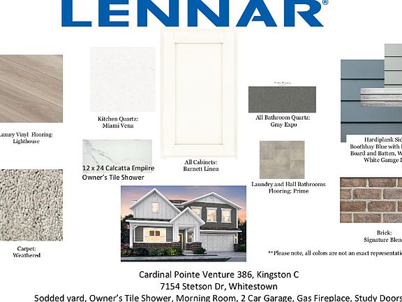 The 2-story Venture Collection at Cardinal Pointe features LENNAR's Everything's Included package of extras & upgrades. Nestled within the lush greenery of the Golf Club of Indiana, Cardinal Pointe residents enjoy on-site pool, playground & walking trail. Social Golf club membership included. The Kingston ft. an open concept design w/a convenient 5th bedroom on the 1st floor, along with a private study & spacious kitchen, dining area & Great Room. Don't miss the light filled morning room! The 2nd story features a media area between the owner's suite & the three secondary bedrooms offer an abundance of space with ample closet space. The owner's suite offers a private bathroom retreat that includes a large shower, dual vanities, private water closet, & a huge WIC. *Photos/Tour of model may show features not selected in home.
