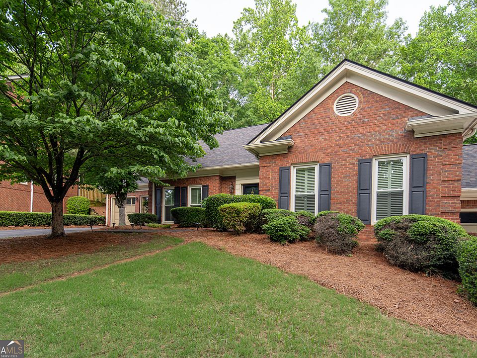 Welcome home to comfortable living in the established Wyngate at Spalding community located in Sandy Springs. Your retreat awaits, a rare corner unit, with this newly painted, carpeted patio home boasting the primary suite, living spaces and entertaining on the main level. The foyer welcomes you, setting the tone for the elegant design throughout the interior including features such as crown molding, transom window accents, and shutters. The Spacious eat-in kitchen offers additional cabinets, stone countertops and breakfast bar. For the distinguished chef, the kitchen boasts a double oven, new gas cooktop, a pantry, plus matching convenient moveable island. The comfortable living layout features a formal dining area, a living room with a fireplace and a new bar and moves through to a floor plan that gracefully unfolds into a large, bright vaulted sunroom with floor to ceiling windows overlooking a private, fenced back yard - the perfect blend of elegance and comfort. The primary suite is on the main level and exudes opulence, boasting a double vanity, whirlpool tub, walk-in shower, and a separate water closet. An additional bedroom with a full bath is also located on the main level, providing ample space for family or guests. For additional comfort retreat upstairs to another bedroom/office and additional fantastic flex space with storage and skylights, perfect for an office, work-out space, or hobby room. There is an abundance of storage closets throughout, ensuring both style and functionality. Wyngate at Spalding doesn't just offer a home; it presents a lifestyle. The property is a spacious haven located in a quiet, gated community, providing tranquility amidst mature trees and well-maintained landscaping and features a swim, tennis and pickle ball courts for your leisure. The HOA takes care of your home's roof, gutters, siding, landscaping, and all common community areas, garbage pickup, water, amenities (swim & tennis) making this a low-maintenance living style at its finest while offering proximity to schools, Chattahoochee Recreational Areas, parks and restaurants and City Springs, the home of entertainment in Sandy Springs!