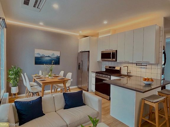 The apartment offers hardwood floors, modern high-end appliances, and a washer and dryer in unit for added convenience. Each bedroom is equipped with its own central AC unit, providing year-round comfort. The bathroom features luxury heated floors, and towel warmer adding a premium touch