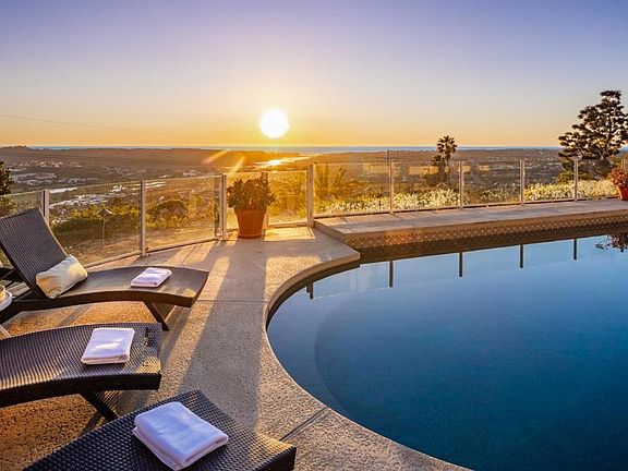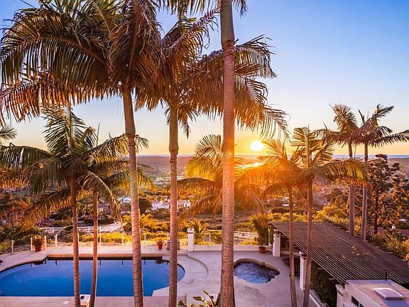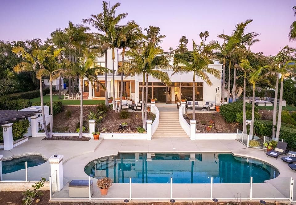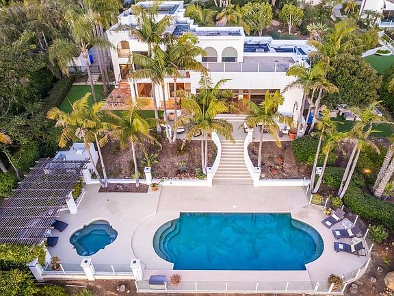 Brilliantly positioned to capture unparalleled lagoon and ocean views that stretch as far as the eye can see. This exceptional gated residence, located within a prestigious enclave of grand La Costa estates, offers nearly 5000 sq ft of sheer opulence. With a generous primary suite, two expansive first floor en-suite bedrooms, two additional second floor bedrooms, a bonus room, and an office, the house caters to a multitude of lifestyles. The magnificent open-concept living room is the heart of the home, adorned with floor-to-ceiling windows that frame the breathtaking panoramas of the expansive backyard, enchanting lagoon, sprawling golf courses, endless sunsets, and ocean views. Cater to your culinary passions in the remodeled chef's kitchen, featuring a large center island and top-of-the-line appliances such as Viking, Sub Zero, Miele, and Wolf, with a 6-burner gas stove, double oven, warming drawer, full-size wine refrigerator, and an array of other high-end amenities. Entertain with ease in the separate formal dining room with a fireplace and adjacent wet bar, or retreat to the outdoor dining area and poolside cabana, all while basking in the rare beauty of unobstructed 180 degree views. A dramatic spiral staircase leads you to the top-floor primary suite, complete with a fireplace and expansive balcony, and a spa-like primary bath with an ocean view bathtub, separate shower, multiple vanities and a large walk-in closet. The second level features a separate wing or in-law suite with two additional bedrooms, a full bath, an office, and a lovely living room, providing ample space for work, relaxation, and entertainment. With a sprawling 37,000 sq ft lot, the nearly one-acre estate is private on all sides, and offers multiple outdoor areas for tranquil enjoyment or hosting gatherings, including a lush side yard with seating area, a large garden with a stone meditation path, and a stunning pool area with cabana and full bath. Additional features include a three-car garage, paid solar panels and pool solar, electric car charger, new HVAC, tankless water heater and more, ensuring every comfort and convenience. This is a rare opportunity to acquire a slice of paradise, conveniently situated near premier shopping centers, golf courses, resorts, schools, theaters, and all the amenities one could desire.