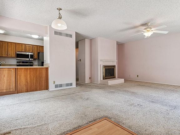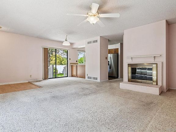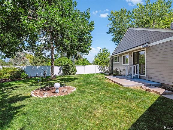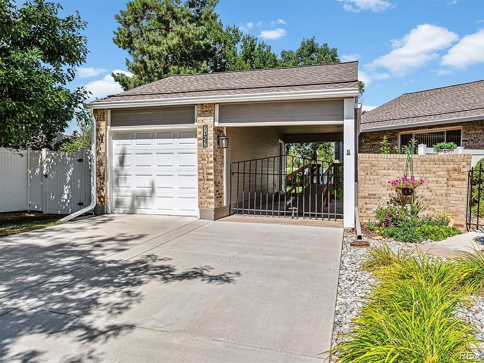 Welcome to this highly desirable ranch-style townhome in the Glenn Oaks community, perfectly situated on a quiet cul-de-sac. As an end unit, this home enjoys extra privacy along with a large fenced yard featuring a 16 x 8 concrete patio and sprinkler system—ideal for outdoor living. Located directly across from The Streets at Southglenn, you’ll have shopping, dining, and entertainment right at your doorstep, plus access to the community pool for added leisure. Inside, the inviting living room showcases a brick gas fireplace and ceiling fan, while the kitchen offers refaced cabinets with pull out shelves and new soft close doors and drawers, solid surface countertops, an undermount sink, pantry and stainless steel appliances. The newly remodeled ¾ bath brings modern style, and the spacious primary bedroom features a large walk-in closet, ceiling fan, and French door accessing the backyard. A laundry room with cabinets adds everyday convenience. This home also offers a detached oversized one-car garage with opener, a covered carport, and a newer concrete driveway. Peace of mind comes with major updates including a newer furnace and air conditioning system, new hot water heater, newer Class 4 impact-resistant roof, new gutters and downspouts and durable Hardie board siding.