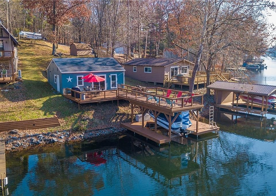 Location, location, location. This Cordry Lake cottage has beautiful waterfront with a very nice deck and dock. The home is 2 bedrooms, 1 bath, with many nice updates. It has an open concept floor plan to maximize square footage. The inside is bright and updated. The updates include: the floors, doors, kitchen and appliances, paneling, light fixtures, bathroom, all cabinetry, bar, all new windows, sliding door, plus the deck and dock. The boat house has an electric lift and large party deck. There's an additional large deck off the house for entertaining, plus a level lot from the house to the water.