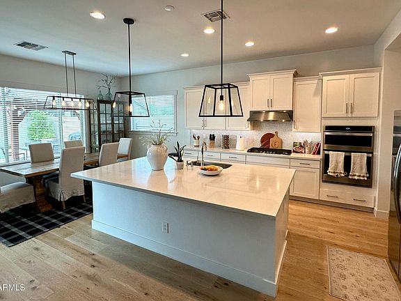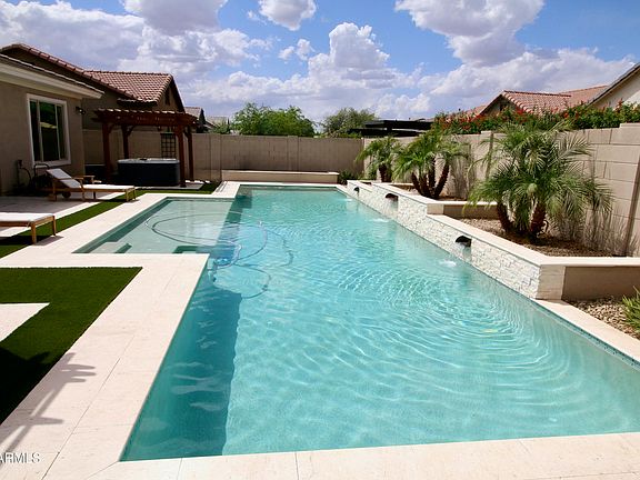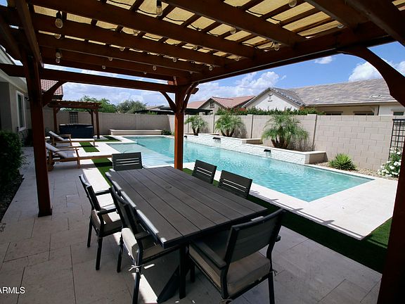 Spacious single-level 4 bdr/3.5 bath home in the desirable Morrison Ranch Desert Place subdivision. This home has many upgrades including, hardwood flooring, custom box panel wall trim, window casings, tray ceilings, plantation shutters, wood blinds, six ceiling fans, quartz counters, and surround sound speakers. The backyard is a summer oasis featuring three raised waterfalls pouring into a 50' swimming pool, two pergolas framing an above-ground spa and outdoor dining, and a large covered patio, all tied together by cool white limestone paving. Note: 4th bedroom is used as a den/office. Seller is a owner/agent.