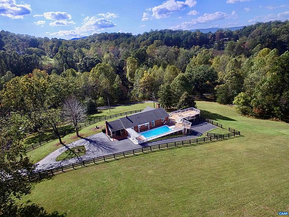Live near the charming village of Batesville in a bucolic setting in Western Albemarle. A delightful brick ranch with a full partially finished basement, perched on a knoll surrounded by open pasture with three-board fencing. The house has wonderful natural light and is built on a commanding site. Features include hardwood floors, knotty pine paneling in the family room and dining room, updated kitchen, sunroom with soapstone floor and flue for a wood stove, and 3 bedrooms and 2 full baths. This home has been well-maintained by the original owners. Outside there is an in-ground pool with extensive decking and a paved driveway that continues around the rear of the home to additional parking at the carport with access to the basement garage. There is a fenced pasture for horses or other livestock and property is suitable for fruit trees or vineyard. Small shed. Property is offered at $398,500 without the adjoining 2.01 acre wooded parcel.