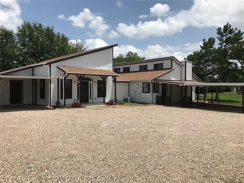 This home on two acres has everything you could want! Two living rooms with soaring vaulted ceilings, fully updated kitchen and a guest wing with two bedrooms and an additional kitchen! The huge master bedroom has dual sinks with granite, glass shower, loft and exterior access to your covered porch overlooking the pond with dock! Upstairs is a large game room. Air conditioned two car detached garage with additional work shop area. Behind the home are three different barns, stables and plenty of parking. 5 carport spaces and plenty of graveled area for additional parking. You have to see this one in person to appreciate all it as to offer.