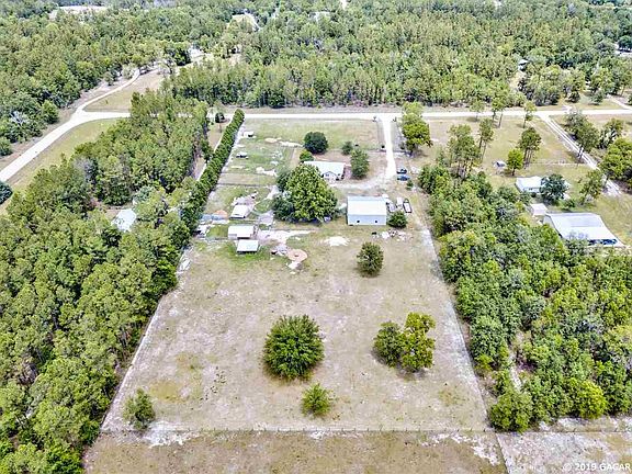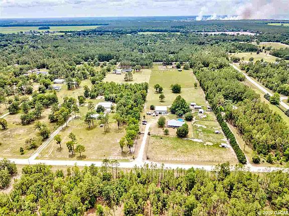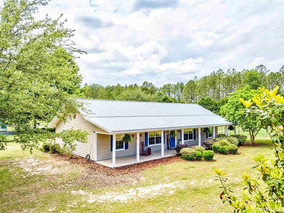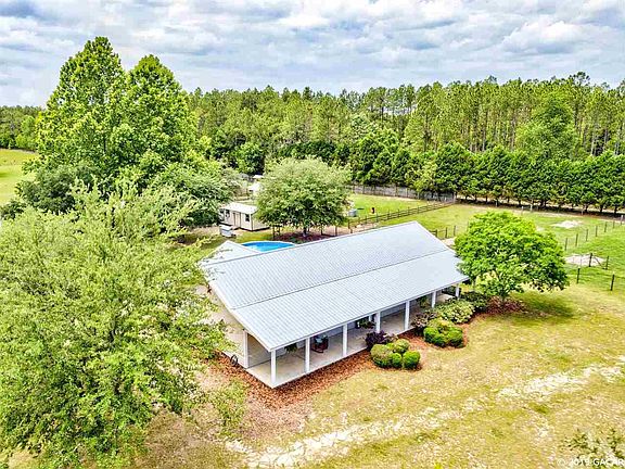 High Springs Modern Farmhouse w/ Forever Metal Roof on 5 scenic acres. Located mins to High Springs, Ginnie/Poe/Blue Springs and the Santa Fe River. Enjoy low Gilchrist County taxes while living right on the line of Alachua County. Ideal to continue as a working farm. Perfect property for the homeowner who needs lots of heavy equipment storage. The oversized front porch is very spacious and inviting and sure to be the place to enjoy sunrise and sunsets with your family. This gated working farm offers a bright & cheerful 3/2 home with open-concept kitchen with breakfast nook, formal dining room, great room, formal living room, split floorplan and laundry room/mud room. Tile throughout most of the home for easy care. Master suite is spacious and has luxury bathroom upgrades. You will love the tall ceilings and bright fresh paint. Very well-maintained. Enjoy the sparkling above-ground pool that requires very little care. The property has two pastures and plenty of shade trees. Property has a 50' x 50' metal building with two lofts and framed-out office. Workshop has electric and water & is well insulated. Other farm features include buck Located a very short drive off paved roads. Roads are county maintained and level.