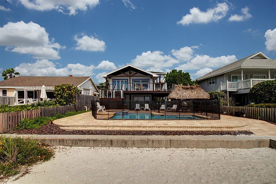 Luxury, income producing, three unit beachfront cottage, with a unique pool and spa only steps away from the beach. The house is located at a very attractive place on the beautiful white sandy beach of Indian Rocks/Gulf of Mexico. Within the house there are three separate rentable units: Unit A is the deluxe poolside studio one bedroom one bath, Unit B is the two bedroom one bath, and Unit C is the 2 bedroom 2 bath. Unit C has a master suite on the second level with its own balcony overlooking the Gulf. Each unit is fully furnished with its own air conditioning thermostat, fully equipped kitchen, living room each with a sleeper sofa and dining room. This unique arrangement offers large parties the ability to vacation together and enjoy privacy within their own unit at night. There are wonderful views of the beach and Gulf from each unit.Outdoor space includes a gas heated pool and spa that uses a non chlorine salt system. The pool has travertine coping and the entire ground level is hard-scaped with large pavers. There is an outdoor cooking area with a grill and a thatched roof Tiki Hut with lights for evening dining. Whether you are eating outside or inside, with your choice of shade or sunshine, the experience is delightful. The ground level has a convenient hot and cold outdoor shower, laundry room, storage room, covered storage and covered parking. The decks are surrounded by cable guardrails that aThis is a legal weekly rental!
