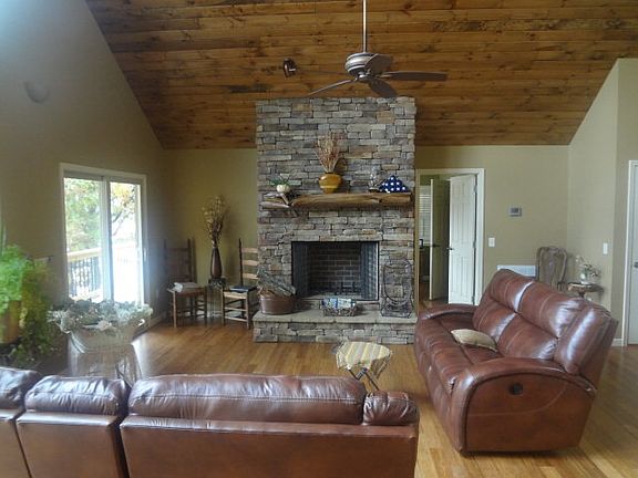 Deep water lake front 2 BR 3.5 Bath custom built home with a 1240sf+- unfinished basement. Each of he three floors have a large deck facing the lake. Top floor has a covered porch for relaxing when the sun is hot or it is raining. First floor has a fireplace & the master bedroom, master bath has a tiled walk-in shower. Improvements have custom cabinets with a bar separating the kitchen and dining area. Floors are covered with Bamboo wood & bathrooms are tiled. Every room faces the lake with access to deck by a glass door. There is also an office and off it is a bathroom and closet. There is a large laundry room on middle floor with a laundry chute from the master bedroom.
