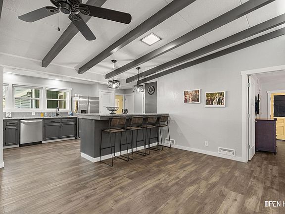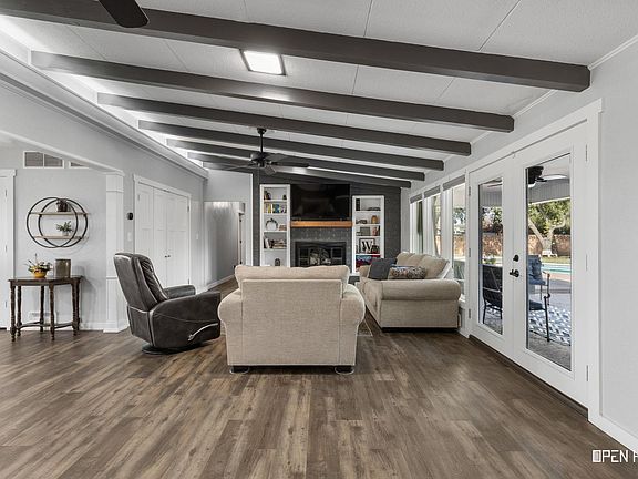 Mid-century modern 5 bed, 3 bath home designed for entertaining. Featuring an isolated master, open concept design, and cozy fireplace. Remodeled in 2022, this property boasts a large swimming pool, pool house with full bath, basement, and 3-car carport. Nestled on a corner lot with mature trees, it blends style, comfort, and functionality in one exceptional home.