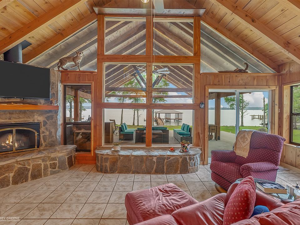 Lakefront Beauty Waiting For You! Built for entertaining & family fun, this 3BR, 3BA home checks all the boxes. Beautifully designed to capture the picturesque views from almost every room, cathedral ceilings in the living room with floor to ceiling windows, stone fireplace & open concept living. Updated kitchen with Corian counters, new stainless appliances and decorative lighting. The warm feel of the knotty pine walls adds to the cozy feel of the home. Newly constructed 24x24 cedar outdoor living area features an outdoor kitchen with refrigerator, stove, sink & plenty of room for family gatherings. Spend your day relaxing in the shade enjoying the view and watching the sunset. Also included, is a 30x50 insulated shop with half bath, electricity & concrete floor. At the waters' edge is a new 30x49 boathouse with electric hoist, 1 bass boat stall & 1 party barge stall with led lights for night fishing, a swim deck & fishing area. Don't miss your chance on this move-in ready oasis.
