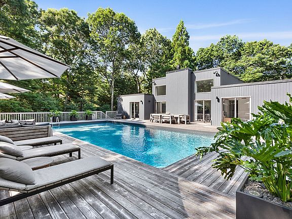 Towering ceilings greet you as you enter the front door into the sun-filled living room. An open kitchen allows you to be close to your guests. The master wing has a large walk in closet, bathroom with Jacuzzi, separate shower and private door to the pool area. The guest wing is a mirror image with a shared bath. The lower level is fully finished and features a large bedroom with an en suite bath with a steam shower, media room with a fireplace, study, gym, laundry room and large pantry. This 3/4 acre property includes a large pool, multiple lounge areas, outdoor shower and a garden. Enjoy your summers at this chic home, just under a half-mile from the beach and minutes to the center of town at a price that is simply stunning!