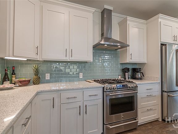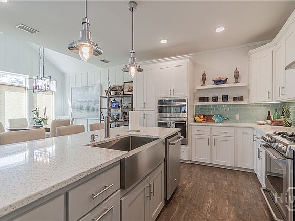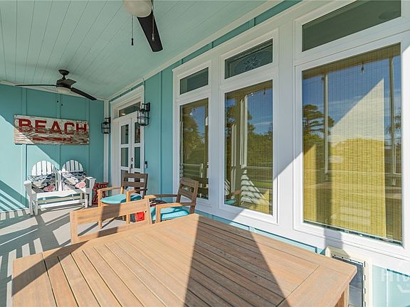 This elegant custom crafted 3 bedroom, 2.5 bath home with a 3 car garage showcases timeless design & modern efficiency located 2.5 blocks from beach access. Built with a standing seam metal roof, foam insulation & 2 Trane HVAC (propane heat) systems, tankless propane water heater, it offers both durability & comfort. The chef's kitchen features large floating island w/ quartz countertop, custom shaker cabinetry, stainless GE Cafe appliances including 6-burner propane cooktop & elegant transom windows in the adjoining dining area. The owner's suite is a private retreat with its own screened porch, spa-like bath w/dual vanities, oversized custom tile shower, water closet & walk-in closet. Additional highlights include LVT flooring throughout, crown moldings, custom interior doors w/ glass knobs, dual screen porches, office w/built ins & a finished 8 x 10 she-shed w/LVT flooring & wood deck. Other features include LED lighting, auto gate-style garage doors, storage room & room for a pool.