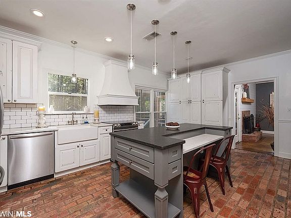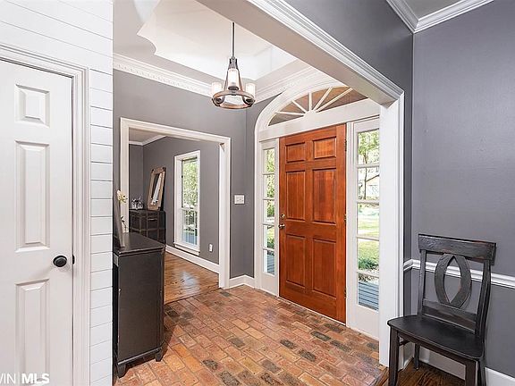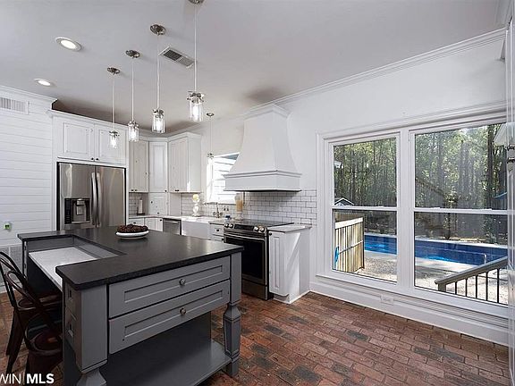 ALL THE HARD STUFF IS DONE!! Pride of ownership shows in this well maintained 4 bedroom 2 1/2 bath home conveniently located in beautiful OLDE TOWN DAPHNE. Tons of charm with a large front porch that wraps to the sides topped with wood ceilings. New roof in 2017. Totally UPDATED KITCHEN with craftsman cherry wood cabinets and a large farmhouse sink. The main floor holds the large master bedroom with its own door to a private deck and completed remodeled master bath, family room with wood burning fireplace and a FLEX ROOM that would be great as an office or a playroom. Upstairs has 3 freshly painted bedrooms and 1 full bath with 2 sinks. Relax and enjoy evenings on the large SCREENED IN BACK PORCH overlooking the SALT WATER POOL with a brand new liner, 16 x 24 shed with A/C and power, and a brand new gorgeous flagstone patio. Fenced in lot that extends 5' past the fence & backs up to a neighborhood with 5 acre parcels that have been left in natural setting. Tons of privacy!