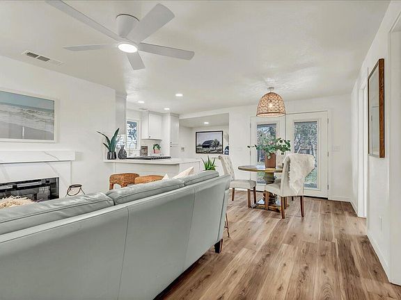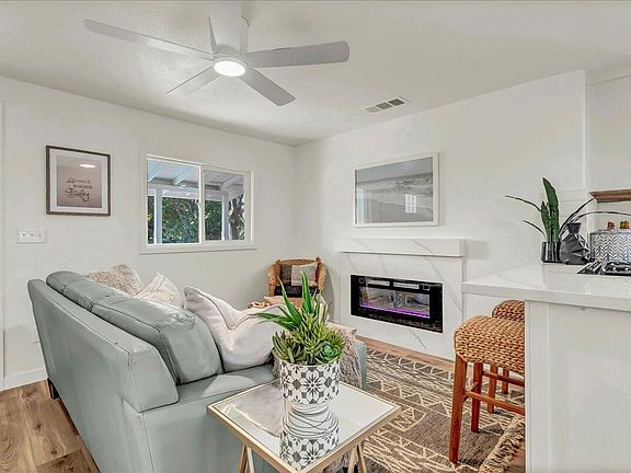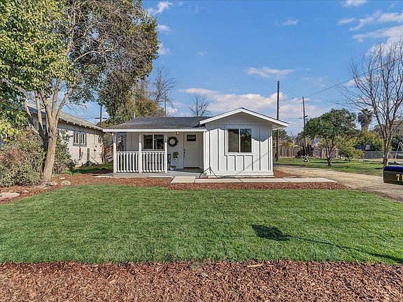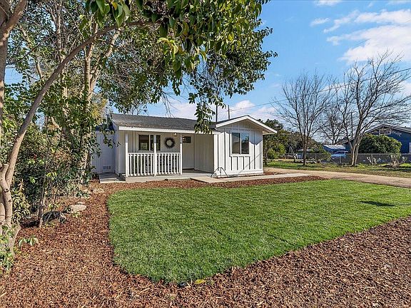 Have you ever seen a more adorable house? It may only be 634 sq ft, but it is a masterpiece of elevated living with casual serene vibes. This home was just remodeled and feels like a brand new build! The front porch is so welcoming, and looks out over the newly installed lush front lawn. Inside is a living room with an electric fireplace and a quartz mantle, dining area and a dreamy kitchen. The counters are luscious quartz with room for bar seating, and the appliances are brand new stainless, with a gas range and pretty white cabinetry. There are 2 bedrooms and one full bath that opens onto the living room and has a pocket door into the primary bedroom as well. There is an indoor laundry area that doubles as a coffee bar, work area, and through a set of French doors is a cozy back patio too. The lot is a large 7841 sq ft-plenty of room to build additional structures. Check with the City of Visalia for ADU possibilities.
