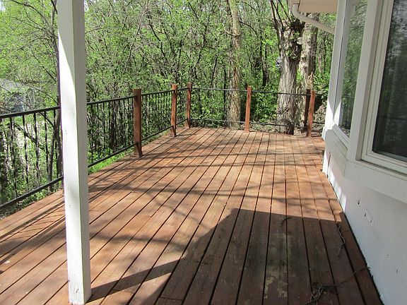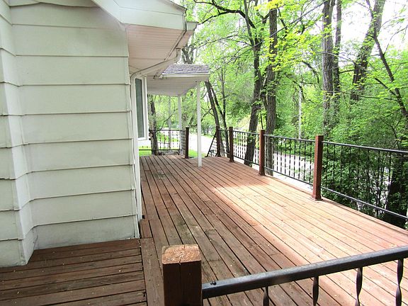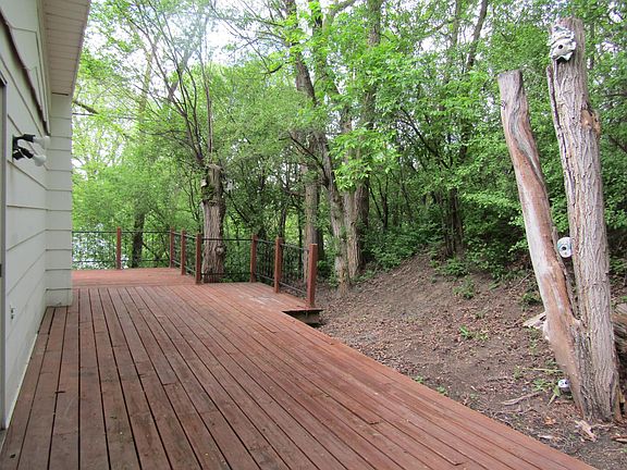 Enjoy beautiful sunrises and sunsets on your very own private wrap around deck! Nestled along the woodside and located on a corner lot, this well maintained move-in ready home offers main floor living with a separate laundry room, full bath, three bedrooms, spacious living room with brick fireplace, recently updated modern kitchen with tiled backsplash and tiled flooring, plus a sliding glass door that leads out to the private deck! Downstairs offers an additional 3/4 bath with shower, family /entertainment room with built-in bar and fireplace, plus a storage/utility room as well. Additional in the large two-car garage! In 2021, new central air conditioner, furnace and water heater ! *City of Montevideo vacated a portion of State Road right of way to the Seller. Legal description will be updated with County. See GIS & Surveyor Map in pictures. East side of property line extends significantly beyond the railroad ties. Neighbor's portable shed currently sets on Seller's property.