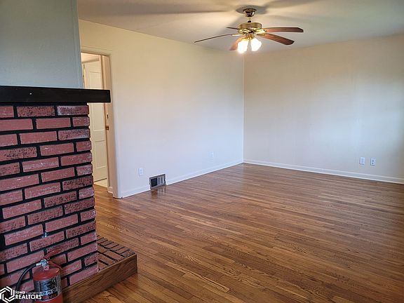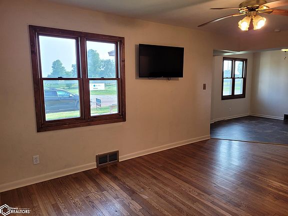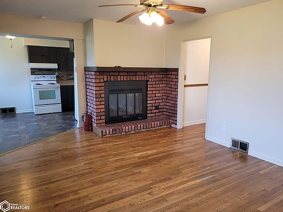 Beautiful hardwood floors! Wood burning fireplace! This charming ranch style home is situated on a double lot on the west end of Sigourney. Features an eat-in kitchen with walk-in pantry, living room, 2 bedrooms, and a nice sized full bathroom. 1.5 car garage, nice patio! Updates include 8 new vinyl windows (purchased from the Amish in Bloomfield) installed in July 2023, kitchen cabinets, bathroom vanity cabinet, new down spouts, furnace 2022, central air unit 2020, new thermostat, house wrapped in Tyvek and new vinyl siding, blown-in insulation in attic, 2 screen doors, stove hood, porch lights, exhaust fan in bathroom,& interior paint. Lot has recently been surveyed, lot pins installed. All appliances and mounted t.v. included (new washer and dryer). Beautiful sunset views! Call to schedule a showing today!!!