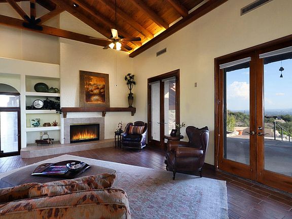 Perched on a Hilltop, this stunning hm boasts one of the best views in Tucson. Incredible twinkling city lights + Mtn views. Soaring, vaulted, plank & beamed ceilings add tremendous character & appeal while the exclusive use of wood tile flooring is both beautiful & practical. Large, open living spaces are enhanced by walls of windows & french doors. Inviting fireplace's are found in the great room & master bedroom suite. The large master suite has city & Mtn views from the bedroom + from the master bathroom. The totally remodeled kitchen is a chefs dream featuring a Wolf commercial gas range, Sub Zero frig, built in coffee system, warming drawer, pot filler & so much more. Gorgeous sparkling blue pool, BBQ center w/sink & add'l fire pit w/bonco seating w/an excess of patios & decking.