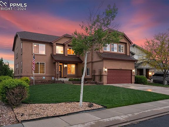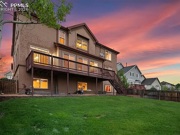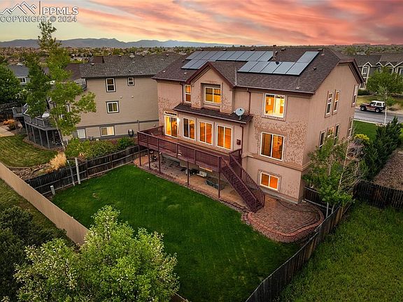 Welcome to your dream home in the popular Stetson Hills neighborhood! This vast 2-story residence, nestled on a peaceful cul-de-sac, boasts a stucco exterior and meticulously manicured landscaping, offering irresistible curb appeal. With a spacious flat driveway, this home presents 6 bedrooms and 4 bathrooms across nearly 3800 sq ft of above grade finished living space. The upper level is a rare find, featuring 5 bedrooms and 3 full baths - plus a bonus upper level gathering room - perfect for growing families or accommodating guests. Revel in the traditional layout, adorned with exquisite wood flooring throughout the main level. The updated kitchen is a culinary haven, complete with built-in dining on an extended island. Plus, a main level bedroom with nearby full bath offers flexibility for a home office or guest quarters. Entertain with ease in the front living room and formal dining space, or unwind in the cozy family room featuring built-ins and a gas fireplace. Step outside to the expansive rear deck, ideal for alfresco dining or relaxing in the sunshine. Benefit from significant savings with installed and paid off Solar Panels by Photon Brothers, resulting in an astonishingly low monthly electric bill! The full unfinished basement provides ample storage, workout space or awaits your personal touch for additional living space. This home has been lovingly cared for and is outfitted with numerous upgrades, including smart technology features, new garage door opener, sprinkler controller, and front door with custom windows. Enjoy added conveniences like remote control blinds, ceiling fans in all bedrooms and living room, and remodeled bathrooms with quartz countertops, tile flooring, water saving raised toilets and more. Situated near the Powers corridor, you'll have easy access to shopping, dining, parks, trails, and schools. Commuting is a breeze with proximity to Peterson or Schriever AFB. Don't miss the opportunity to make this exceptional property your own!