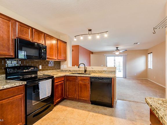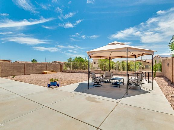 Awesome home in Sunset Point in Buckeye, AZ! Beautiful New Carpet, New Exterior and Interior Paint, Southwest Colors. All Appliances including Washer/Dryer/Refrigerator convey. Cabinets throughout home are dark maple wood, Granite Counter tops in Kitchen with deep cast iron sink. Ceiling Fans in all rooms. Amazing Entertainers backyard backs the common area, has extra concrete along entire back of the home includes Gazebo and patio furniture, BBQ Smoker with separate New Gazebo umbrella. Garage has workshop and storage cabinets. Solar Leases provide for low energy bills, buyer to assume solar leases. Air Conditioner has new blower fan and capacitor. Come take a look, you will LOVE it!