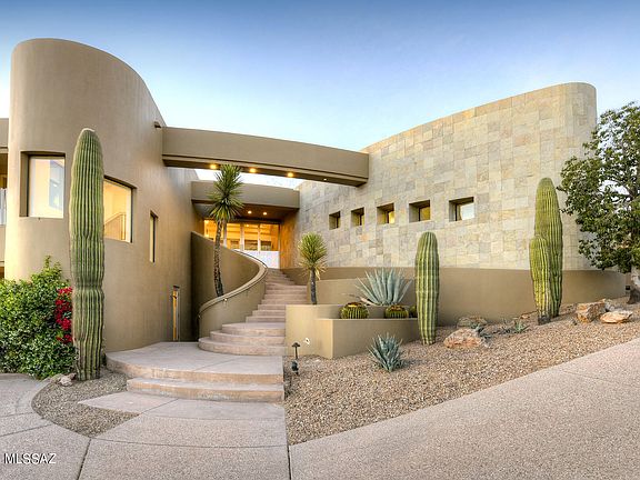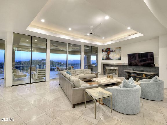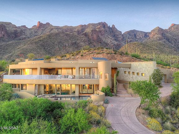 A visually stunning 5,878 sq. ft. contemporary masterpiece, designed by renowned architect Ron Robinette, is nestled on a high foothills lot at the end of a quiet cul-de-sac in gated Foothills II and offers sweeping 180 degree Tucson city views! The spectacular estate is a fusion of architecture and sophisticated amenities wrapped in finishes of limestone and glass, accented by designer touches and lighting. Highlights of the 4-bedroom (plus office/den), 4.5-bath home includes a grand entry & foyer, high ceilings, walls of glass overlooking the entire city, and extensive use of stone flooring. The spacious living room, open to the dining room and the kitchen offers a corner fireplace, walls of glass and access to the 1,200 sq. ft. covered balcony. The balcony with outdoor kitchen and dramatic views is perfect for entertaining guest. The uber contemporary gourmet kitchen provides designer appliances including a gas cook-top, granite & natural stone counter tops, a walk-in pantry and a breakfast area. The gracious primary suite features a fireplace, balcony access, and an expansive bathroom complete with dual walk-in closets with built-ins, dual vanities, a spa tub and an oversized glass steam shower. The lower-level guest suite offers a generous family room, a bedroom, a bathroom, a kitchenette and a exercise room. Walk out from the guest suite to professional landscaped grounds, an outdoor fireplace, a built-in BBQ, and a negative-edge Pebble Tec pool & a spa with a spillway. Additional features include an owned solar system, a oversized 3-car garage, and an abundance of storage. District #16 schools.