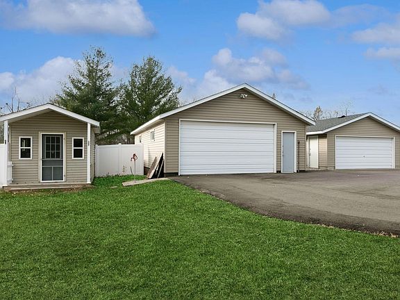Welcome Home! This beautiful one-level home sits on 3.63 acres. Main floor laundry and mudroom are generously sized for convenience. The user-friendly kitchen opens to a bright sunroom with a gas fireplace, all overlooking a large yard with charming landscaping and a meandering creek. The lower level features a spacious third bedroom, a family room, Additional Updated Bathroom and ample storage space. Outside, an array of outbuildings includes a 24x36 heated shop, a two-car detached garage, and a useful storage shed with power and water. This well-maintained property offers modern updates, including a new furnace, A/C, stainless steel appliances, Roof, Asphalt Drive-way, Septic Tank, New Flooring Throughout and renovated bathrooms. Enjoy the perfect blend of nature and comfort in this inviting home.