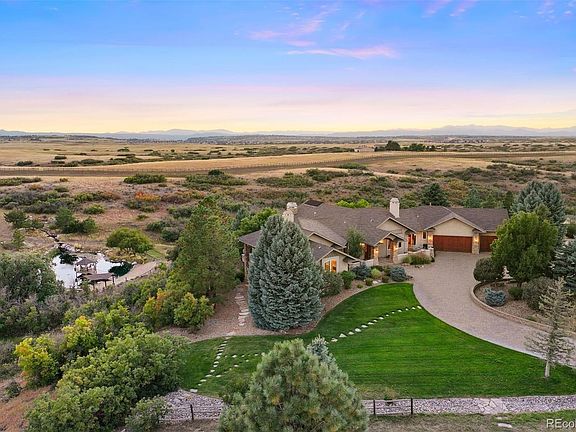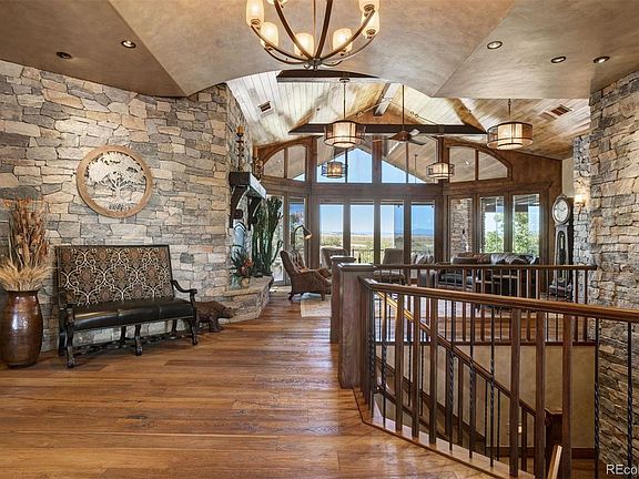 Surrounded by spectacular natural beauty and offering ultimate privacy, this expansive estate caters to the beauty of the outdoors year-round. The 180-degree views of the Rocky Mountains, including Pikes Peak, Mt. Evans, and Longs Peak, serve as a majestic backdrop, creating a sense of awe from every window. Enjoy endless recreational options, from a fish-stocked pond with a sandy beach and cabana-style dock, surrounded by walking trails, to a spacious barn and separate workshop perfect for hobbies or storage. A private, gated entry winds down a tree-lined paver drive, partially heated for snowmelt during winter. This exceptional property is offered with most furnishings and equipment included, making it a turnkey opportunity to enjoy its incredible lifestyle.