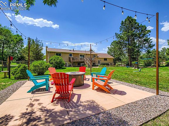 Welcome to this beautiful maintained bi-level home located on a full acre in the sought-after community of Falcon Estates! As you enter this home on the circular drive, you are greeted by an abundance of space on this fully fenced, oversized lot with mature trees. Cozy floor plan flows through the upper level to a bright living room with a large window of mountain views and a wood-slat feature wall, modern updated kitchen with stainless steel appliances and a vaulted ceiling/skylight, dining area that walks out to the upper 24x8 back deck, and a private primary bedroom suite with attached bath. Two additional bedrooms, and a 3/4 bath complete the main level. Peaceful backyard oasis offers beautiful landscaping, bird houses and baths, a firepit with 4 Adirondack chairs, lighting, 3 stone benches, windmill, decorative deer, and a water feature with a pond and cat tails. Finished lower garden level features a laundry room, two more bedrooms, a 3/4 bath, and a large family room with gas fireplace that walks out to the lower paved 34x10 patio. Home amenities include natural wood and LVP floors, central air, ceiling fans, updates throughout, and low maintenance exterior stucco and brick. Attached 2-car garage as well as a 2-car detached garage with a large workshop. City water and no HOA dues. Close to shopping and dining on I-25 and within minutes of the Academy Blvd corridor. Award-winning D-20 schools. Easy drive to nearby Pulpit Rock, Blodgett Peak, and Ute Valley Park. Stunning panoramic mountain views. Don't miss this rare opportunity to enjoy the privacy and space of country living in the middle of the city!